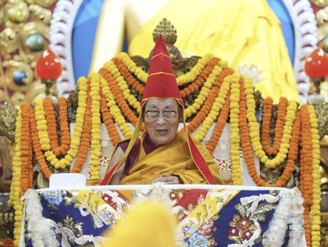 His Holiness the Dalai Lama wearing a red pandita's hat during the long-life prayer ceremony at the Main Temple in Dharamshala on Sept. 18, 2024 (Photo/OHHDL/Tenzin Choejor)